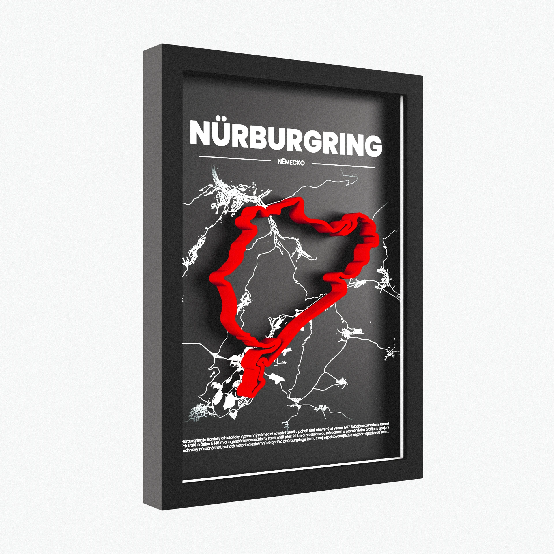 Vyber si svůj oblíbený závodní okruh – Nürburgring, Spa, Monza, Red Bull Ring nebo jiný – a nech si ho vyrobit v elegantním rámu jako 3D model. Díky možnosti vlastní personalizace můžeš na obraz doplnit jméno, vůz, motorku, SPZ, čas kola nebo datum jízdy – a tím z něj udělat naprosto jedinečný kousek. Originální dekorace na zeď pro všechny, kteří milují rychlost a vůni benzínu.